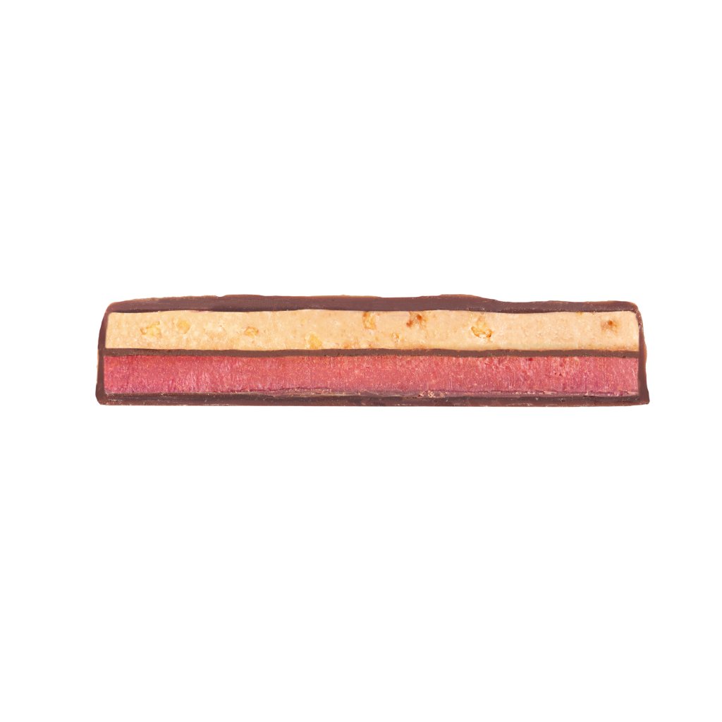 Ovocná a veganská! Ovesná čokoláda s 50% obsahem kakaa láká růžovočervenou ovocnou vrstvou jahod, třešní, malinovo-kokosové polevy, brusinkové polevy a nádechem osvěžujícího citronu. K tomu se přidává vrstva mandlového nugátu okořeněná kousky mučenky, pomeranči a citrony. Mezi nimi tenká, křupavá vrstva hořké čokolády.